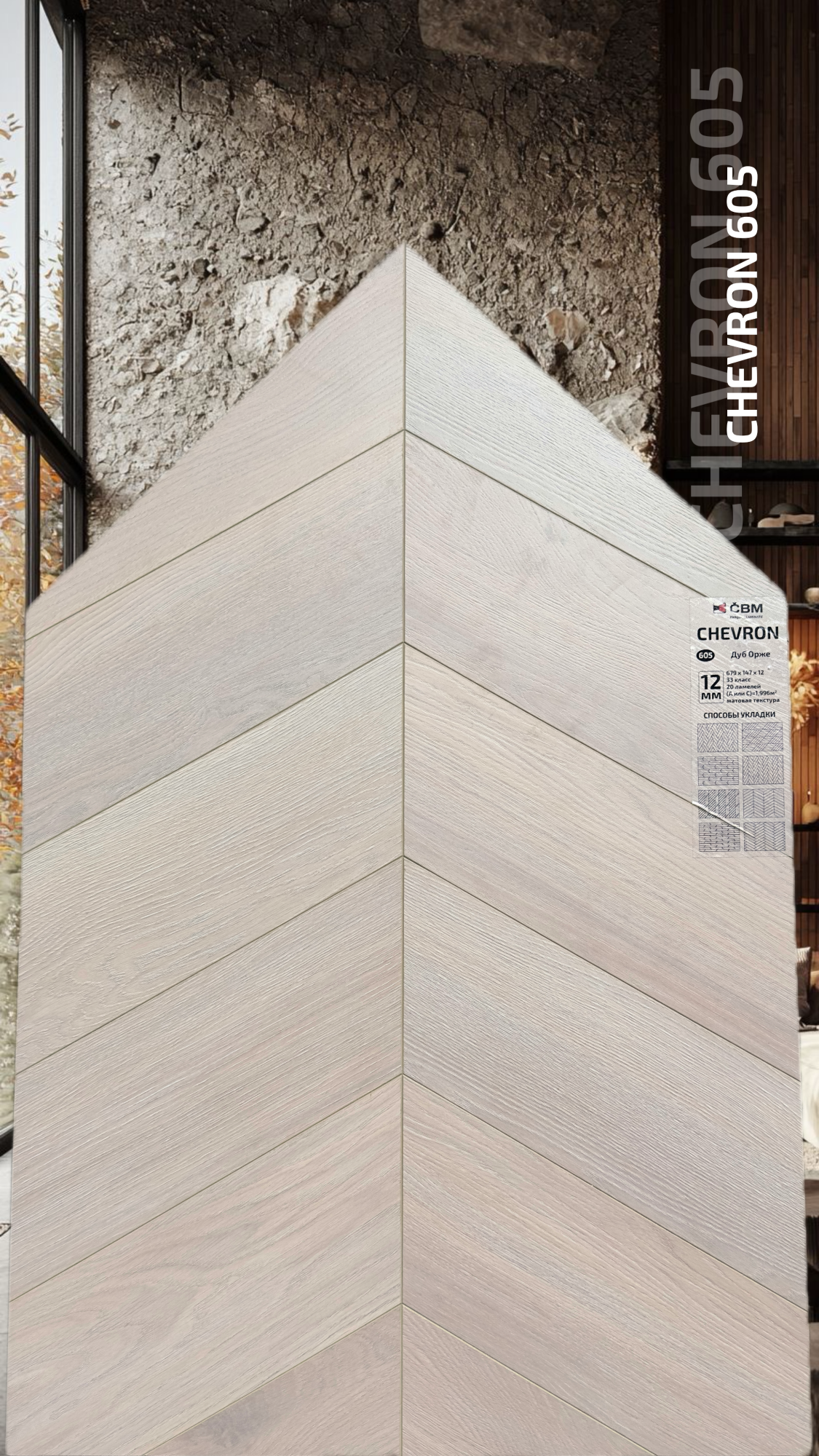 Страна производства Чехия Коллекция Chevron Класс пожарной опасности КМ 3 Производители ламината Cbm Класс ламината 33 Толщина доски ламината 12 мм Размеры доски ламината 679х147 мм Вид\Имитация материала Ёлочка Упаковка ламината 1,996 м2, досок (20 шт одной стороны (А или С), 19 кг. Наличие фаски ламината 4х-сторонняя Влагостойкость ламината Повышенная Срок эксплуатации ламината (в домашних условиях) 25 лет -