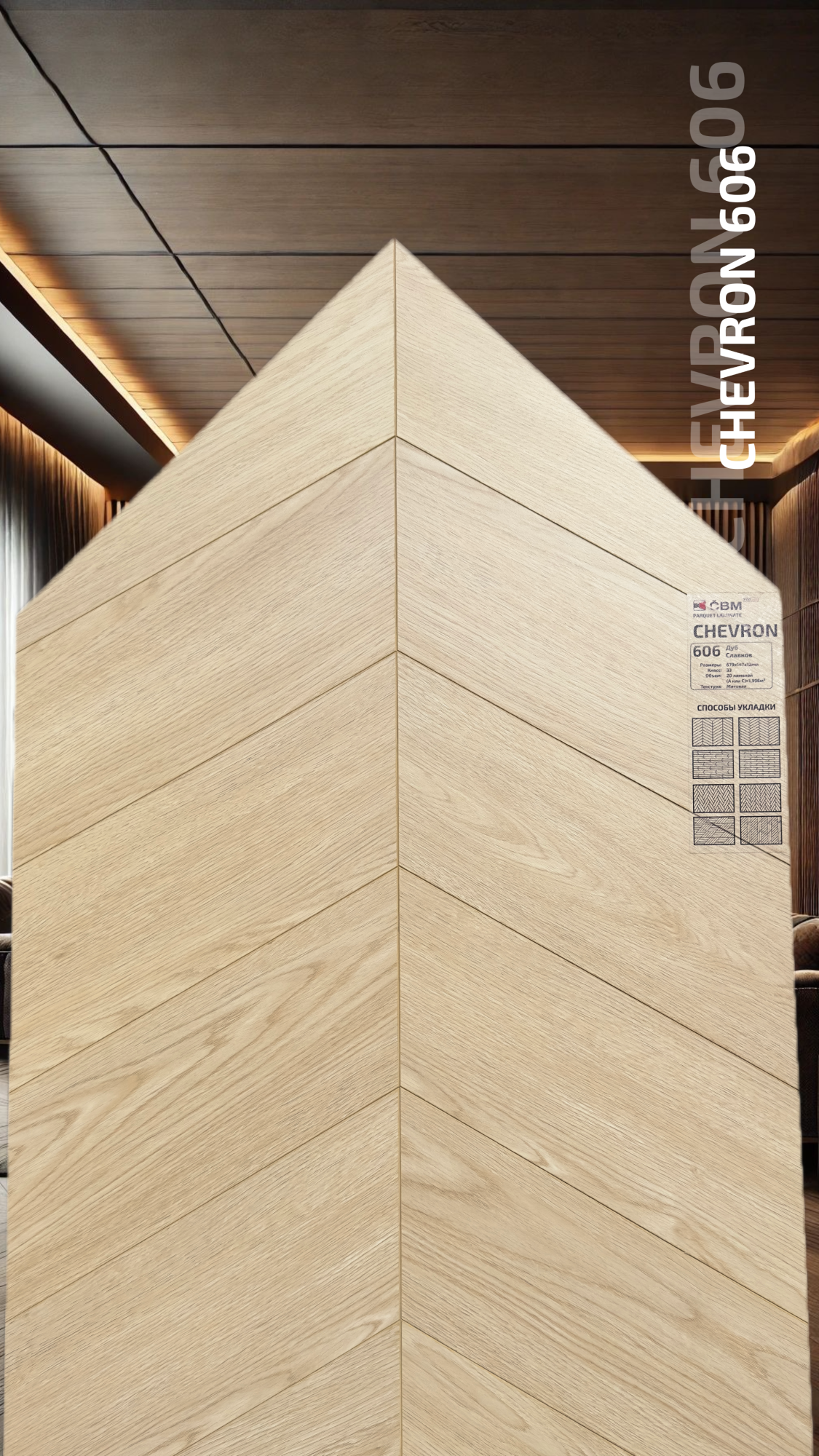 Страна производства Чехия Коллекция Chevron Класс пожарной опасности КМ 3 Производители ламината Cbm Класс ламината 33 Толщина доски ламината 12 мм Размеры доски ламината 679х147 мм Вид\Имитация материала Ёлочка Упаковка ламината 1,996 м2, досок (20 шт одной стороны (А или С), 19 кг. Наличие фаски ламината 4х-сторонняя Влагостойкость ламината Повышенная Срок эксплуатации ламината (в домашних условиях) 25 лет -