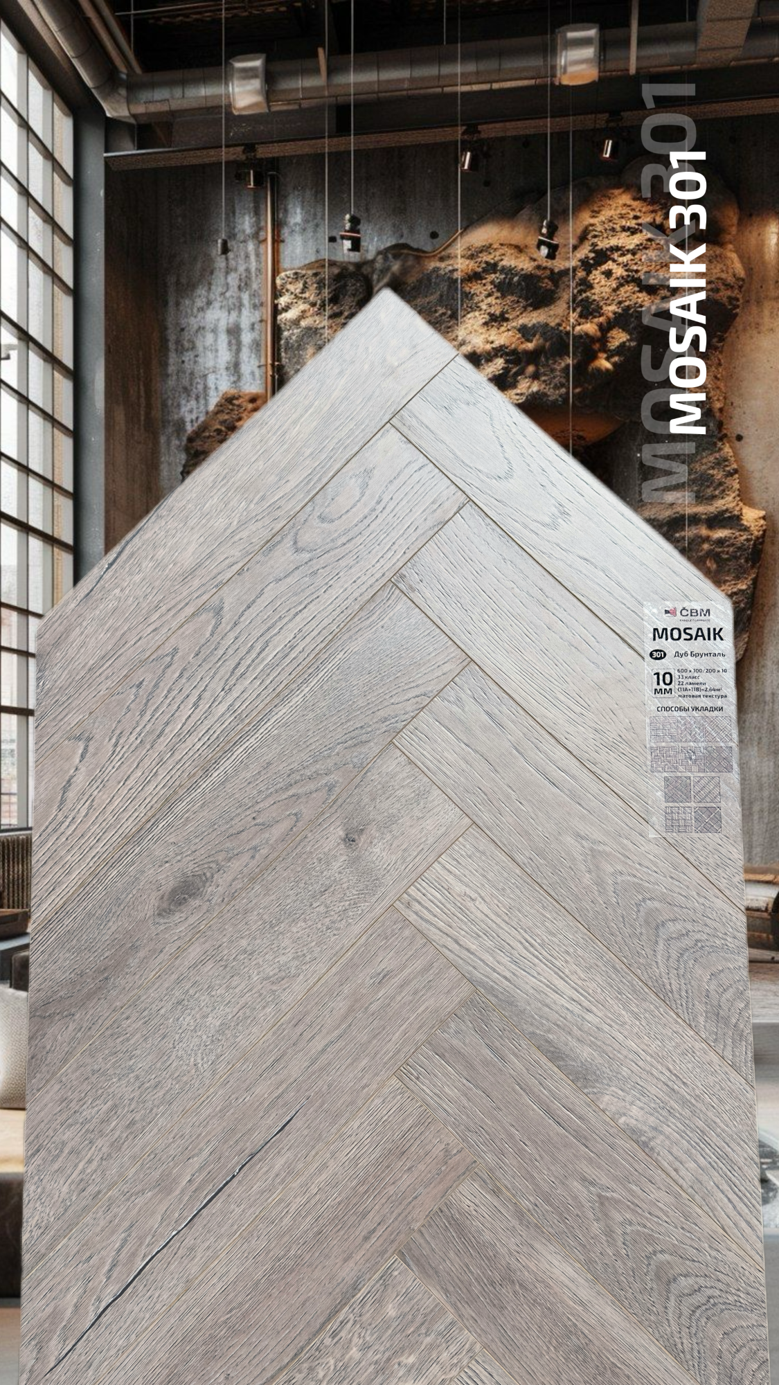Страна производства Чехия Коллекция Mosaik Класс пожарной опасности КМ 3 Производители ламината Cbm Класс ламината 33 Толщина доски ламината 10 мм Размеры доски ламината 600х100 мм Вид\Имитация материала Ёлочка Упаковка ламината 2,64 м2, досок (22А+22В), 23,4 кг. Наличие фаски ламината 4х-сторонняя Влагостойкость ламината Повышенная Срок эксплуатации ламината (в домашних условиях) 25 лет -