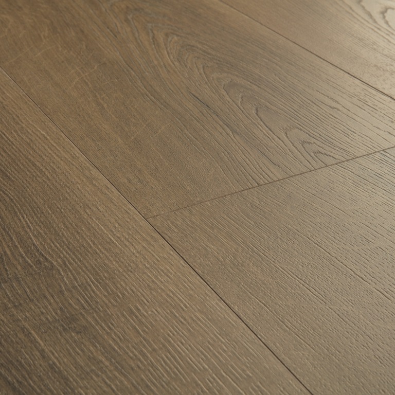 Ламинат Quick Step (Квик степ) Дуб теплый коричневый — надежное напольное покрытие для квартиры и коммерческих помещений с умеренной нагрузкой. Темно-коричневый цвет с теплым подтоном создает уютную атмосферу, а однополосный рисунок и четырехсторонняя фаска формируют четкую геометрию пола, напоминающую массивную доску.