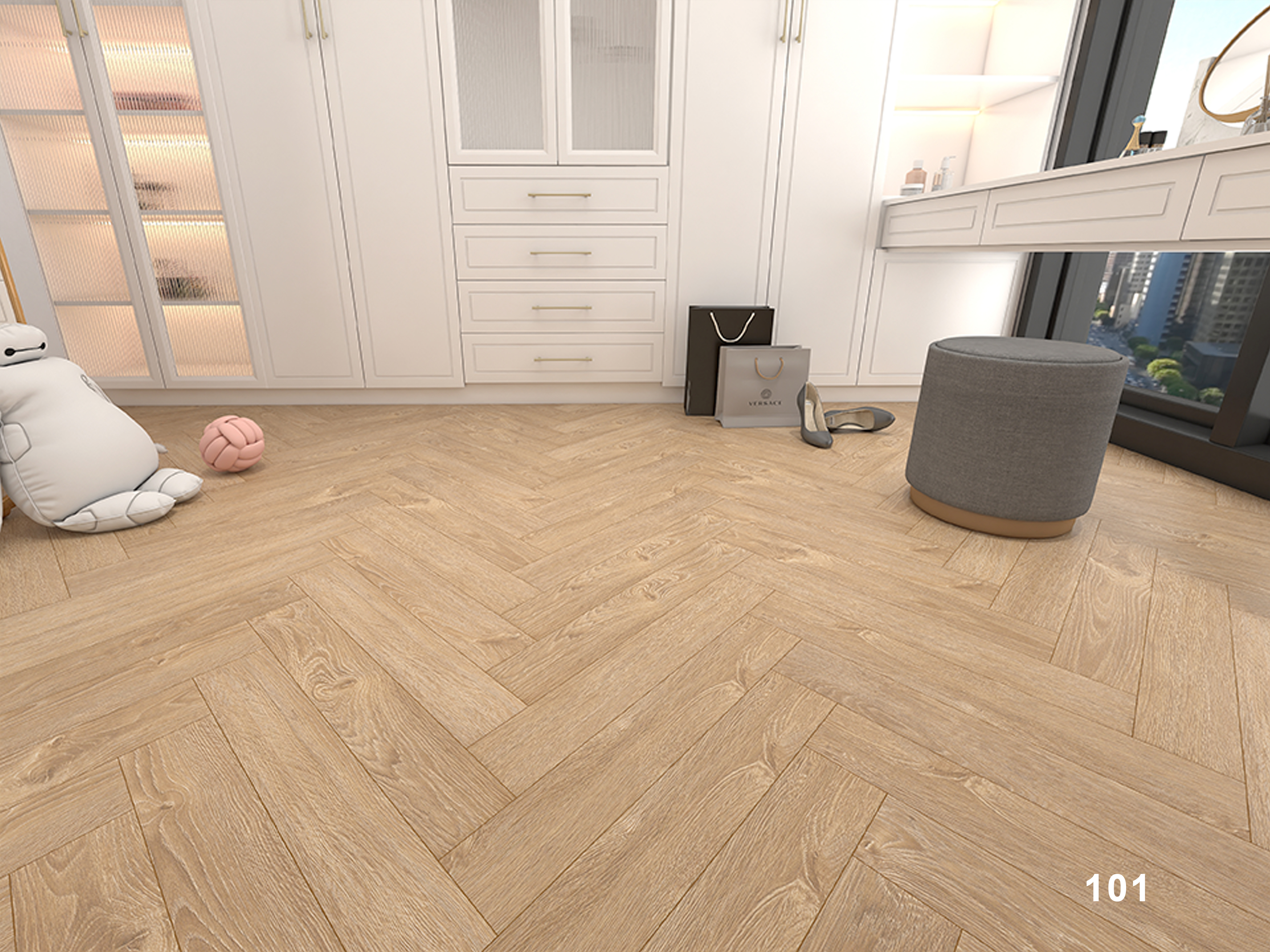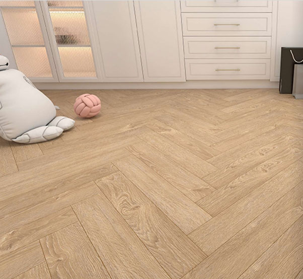Особенность ламината – дизайн в стиле «елочка», который придает помещению уникальность и выразительность. Также важным преимуществом является наличие 4-сторонней фаски, что придает доскам больше объема и визуально расширяет пространство.