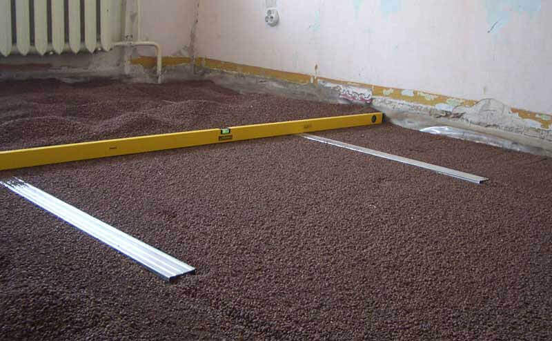 • Сухую засыпку, например, мелкофракционный керамзит, выкладывают на пол по маякам и разравнивают правилом.